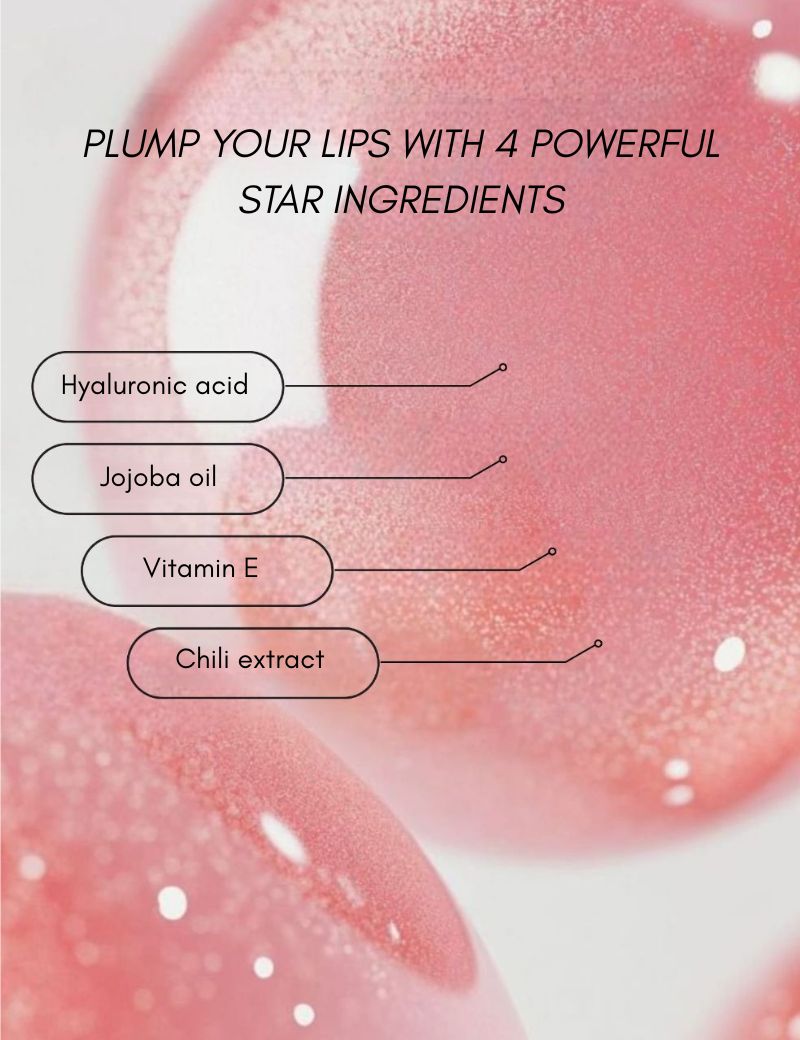 Enriched with chili pepper extract and hyaluronic acid to plump your lips, jojoba oil to nourish them, and vitamin E to protect them, it combines care and seduction in a single step. The result: plump, soft, and irresistible lips that never go unnoticed.